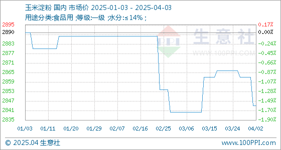 4月3日,生意社玉米淀粉基准价为2844.00元/吨,与本月初(2862.00元/吨)相比,下降了-0.63%。