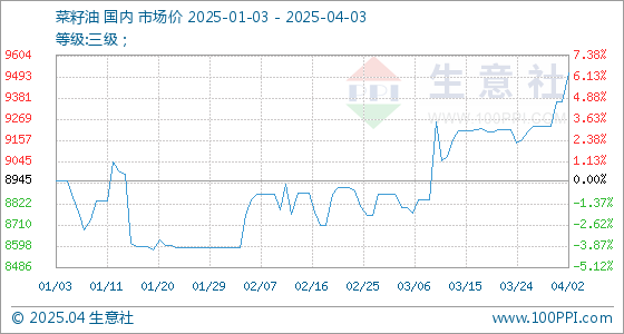 4月3日,生意社菜籽油基准价为9511.67元/吨,与本月初(9361.67元/吨)相比,上涨了1.60%。