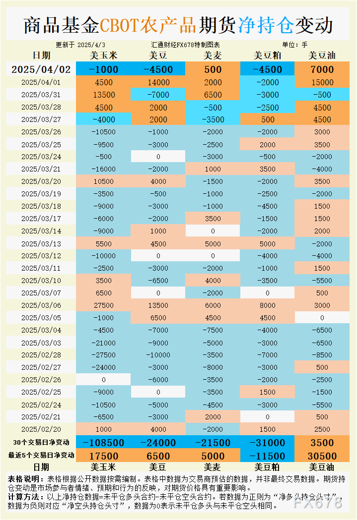 持仓变动:基金4月2日净买入500手小麦,过去5日净增5000手,与30日累计净空头21500手形成反差,显示短期看涨情绪。