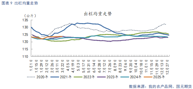 截止3月21日,生猪出栏均重123.84公斤,较上季度末环比增加0.49公斤。节后猪价走弱,标肥价差逆势走扩,养殖户压栏增利心态较强,当前出栏均重处于近四年高位,单头生猪提供的肉量增加,二季度或面临量重双高的局面,进一步放大供给压力。