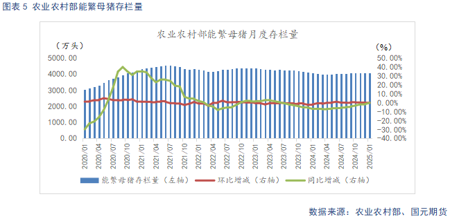 根据农业农村部数据显示,2025年1月末全国能繁母猪存栏量4062万头,同比下降0.1%,环比下调0.04%。根据农业农村部新修正的《生猪产能调控实施方案》,当前能繁存栏相当于正常保有量的104.2%,处于绿色偏高区域。24年4月至24年11月,能繁母猪存栏持续回升,从生产周期推算,2025年一二季度,进入产能增长兑现期,供给压力偏大。不过24年12月至25年1月,能繁母猪存栏出现环比回落,后续仍需观察产能调减的持续程度。