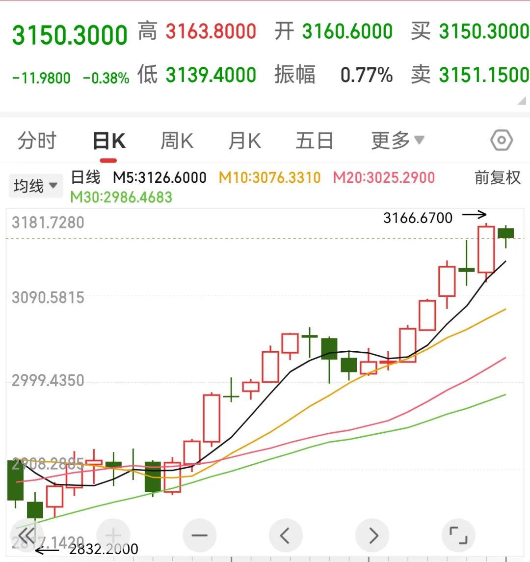 北京时间4月3日,伦敦现货黄金升破3150美元/盎司关口,继续创历史新高,截至3日7时50分左右,报3166.67美元/盎司。