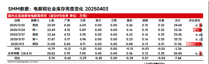 国内铜库存方面:截至4月3日周四,SMM全国主流地区铜库存较周一大幅下降2.36万吨至31.36万吨,较上周四下降2.09万吨,实现连续5周周度去库,目前较年内高位回落了6.34万吨,较去年同期低7.44万吨。