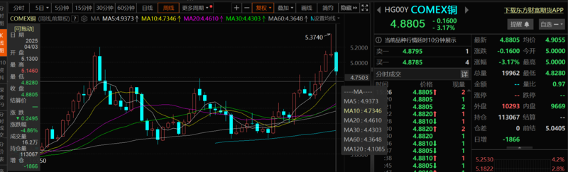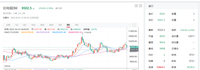 特朗普于4月2日宣布“对等关税”,幅度超出市场预期,引发了市场对美国经济“滞胀”风险和全球贸易冲突加剧的担忧升温,这将使得铜等有色金属需求前景蒙阴,三大交易所铜期货在4月3日均出现下跌,截至4月3日15:08分,伦铜跌2.25%,报9502.5美元/吨,其周线跌幅目前暂时为2.98%;沪铜跌1.28%,报78860元/吨,其周线跌幅为2.27%;截至4月3日15:37分,COMEX铜跌3.17%,报4.8805美元/磅,其周线跌幅目前暂时为4.86%。