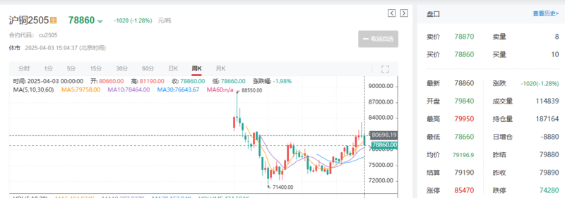 铜管金源期货研报指出:虽然美国对等关税的全球基线税率偏低,但对部分国家的征收的特定关税超出市场预期,贸易伙伴国宣布将立即实施反制措施,全球贸易摩擦正式拉开帷幕,市场风险偏好大幅回落,铜作为全球经济晴雨表难免承压;基本面上,第一量子撤销巴拿马铜矿国际仲裁,3月我国精铜产量环比回升,国内去库放缓,预计铜价短期将维持偏弱震荡走势。