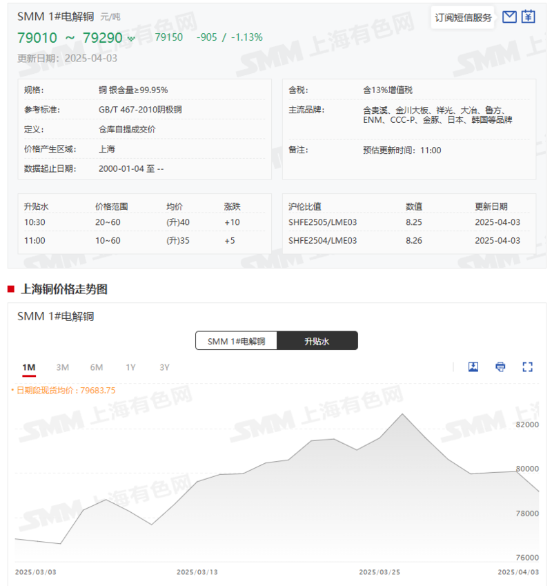 现货价格方面:4月3日,SMM1#电解铜现货的均价为79150元/吨,较前一交易日跌905元/吨,跌幅为1.13%。SMM1#电解铜本周跌多涨少。