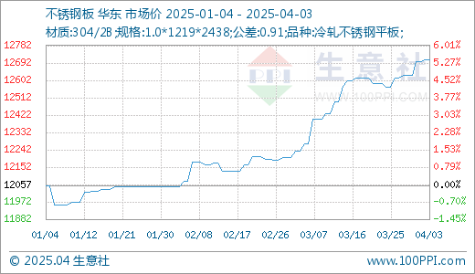 据生意社价格监测,本周不锈钢价格小幅上涨。截止4月3日,现货304/2B不锈钢平板1.0*1219*2438(公差0.91)的日均价为现报价12707.14元/吨,较周初上涨0.06%,同比上不1.63%。