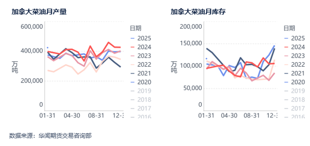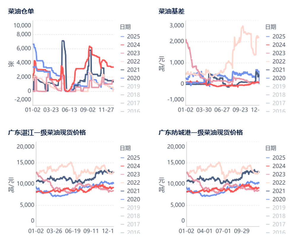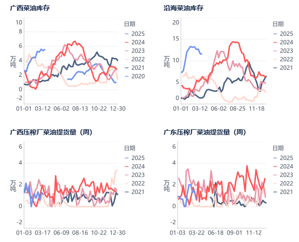 国内进口油菜籽库存处于较高水平,短期压制国内菜油上方空间。粮油商务网监测数据显示,截止到2025年第12周末,国内进口油菜籽库存总量为50.3万吨,较上周的48.9万吨增加1.4万吨,去年同期为39.4万吨,五周平均为50.7万吨。