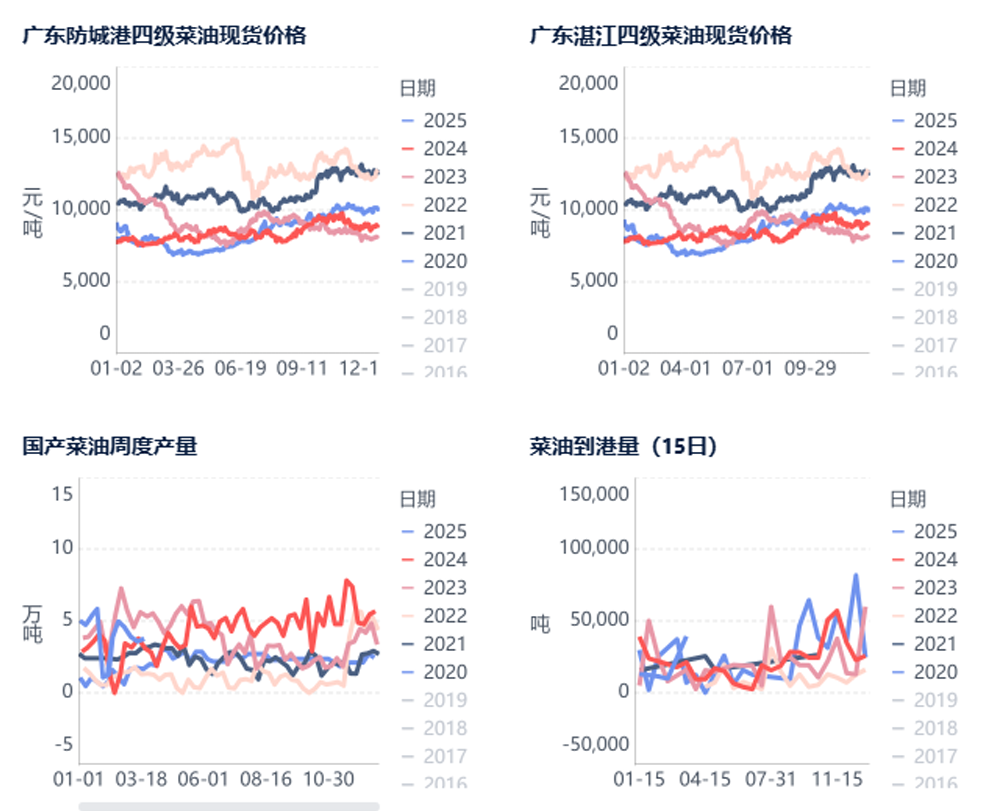 粮油商务网监测数据显示,2025年3-5月的油菜籽到港预估量分别为10.5、10、12.5万吨,海关数据显示去年同期分别为38、47、45万吨。
