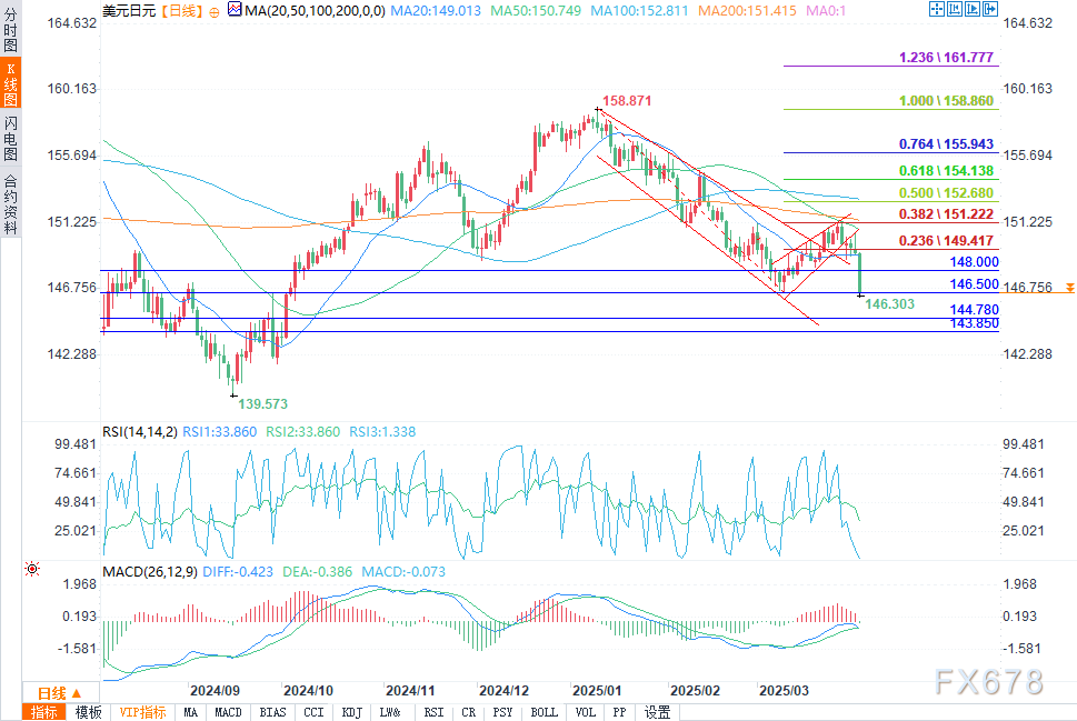 美元/日元汇率盘中暴跌至146.30附近,经历了自2024年夏季以来最糟糕的单日跌幅(约-1.83%)。特朗普的对等关税在一些地区比预期中更为严格。这种情况加剧了投资者对美国贸易政策影响的担忧。