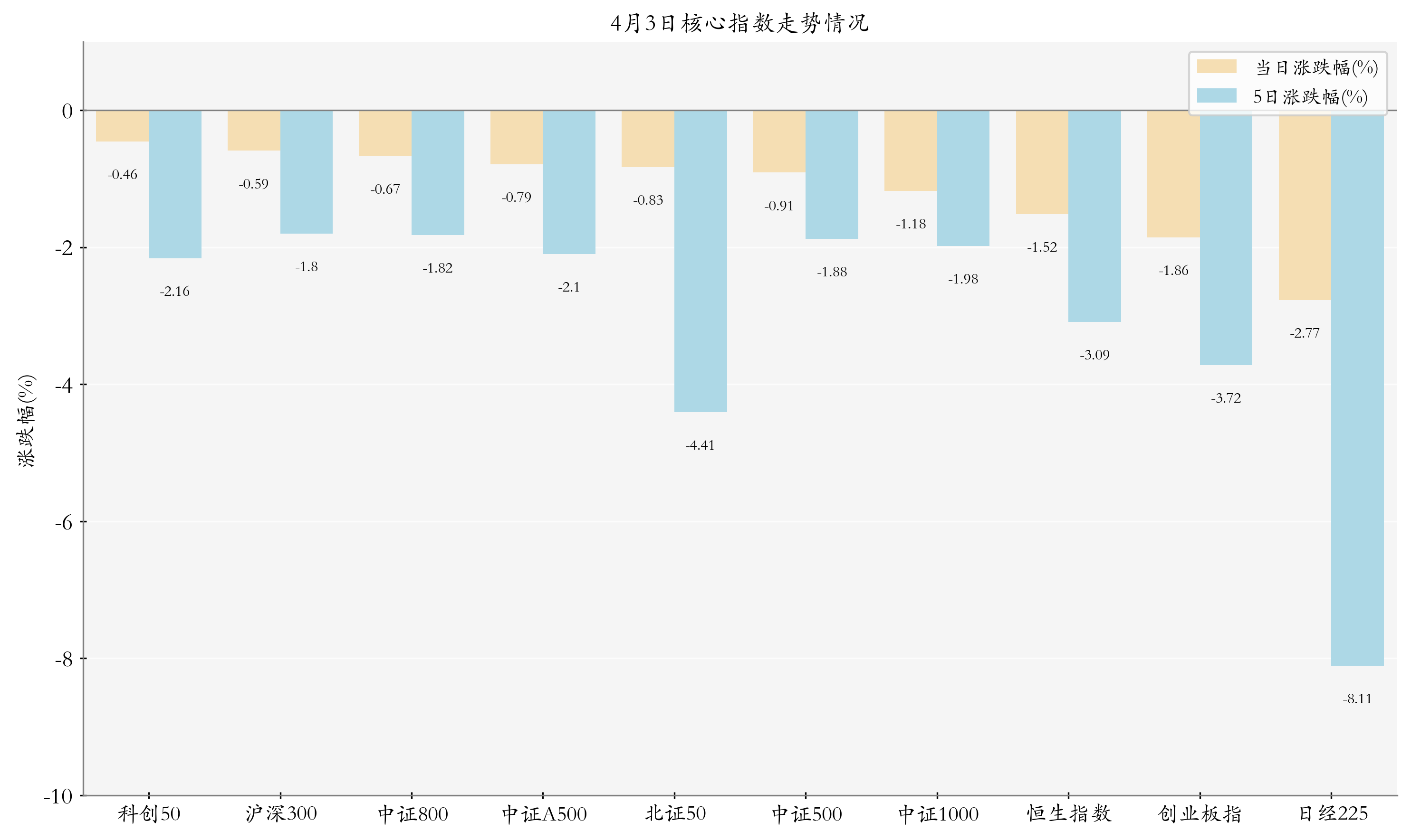 统计A股与海外主要核心指数走势,今日(4月3日,下同)三大指数集体下跌,其中上证指数下跌0.24%,收于3342.01点,日内最高3358.43点;深证成指下跌1.4%,收于10365.73点,日内最高10481.6点;创业板指下跌1.86%,收于2065.4点,日内最高2097.67点。今日科创50、沪深300与中证800走势排名靠前,日涨跌幅分别为-0.46%、-0.59%与-0.67%;近5个交易日沪深300、中证800与中证500的走势排名靠前,近5日涨跌幅分别为-1.8%、-1.82%与-1.88%。