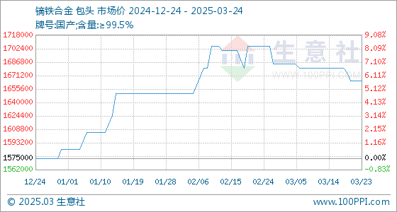 3月24日,生意社镝铁合金基准价为1665000.00元/吨,与本月初(1685000.00元/吨)相比,下降了-1.19%。