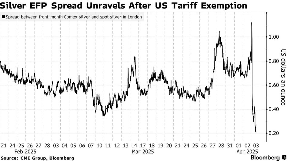 在美国总统唐纳德.特朗普周三宣布贵金属将不受其全面关税的影响后,吸引了数百亿美元黄金和白银流入美国的套利交易狂欢戛然而止。