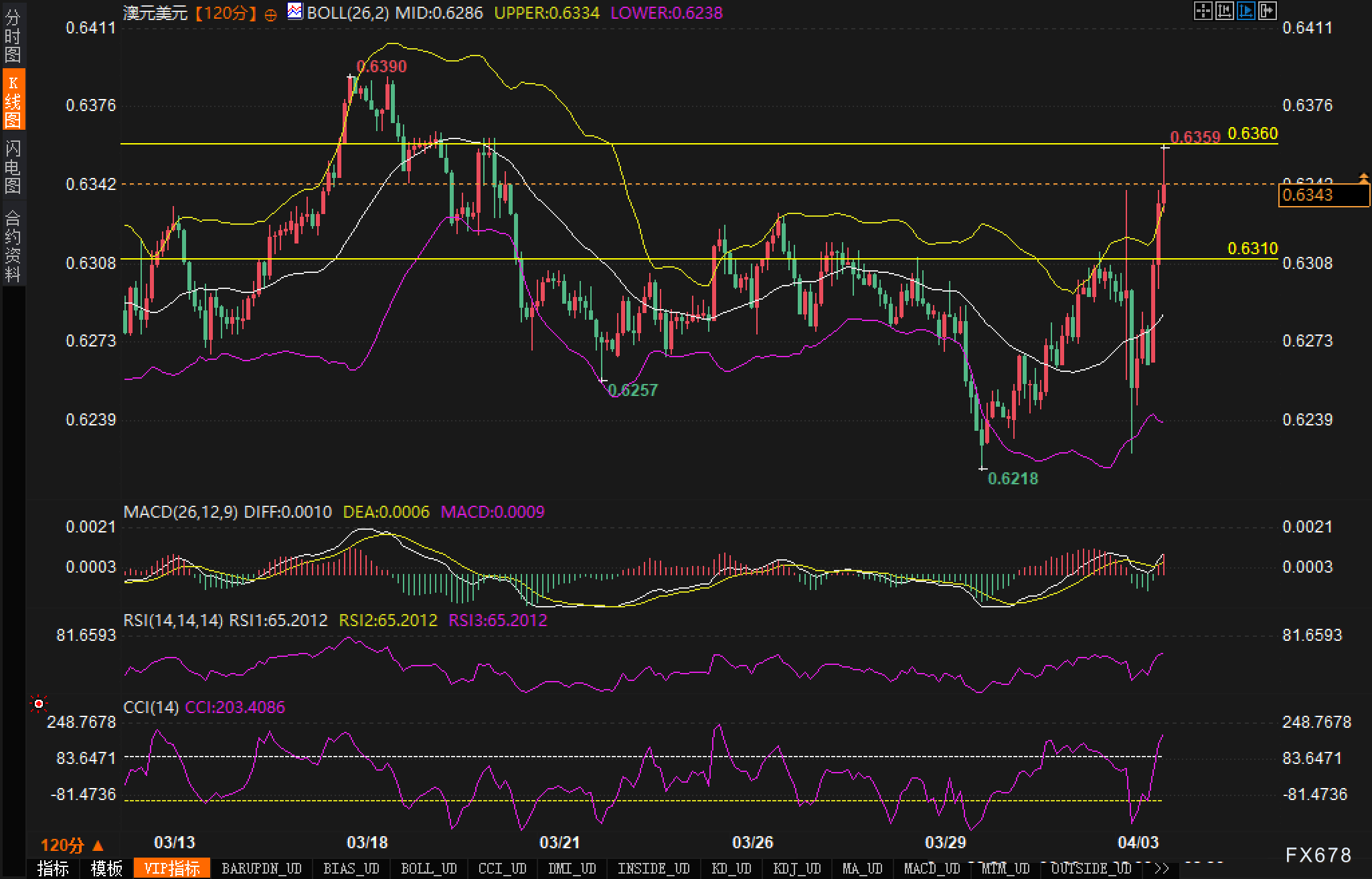 从120分钟图上可以看出,澳元/美元近期呈现出复杂的震荡形态。布林带指标显示中轨位于0.6286,为当前的即时支撑位。值得注意的是,价格已从布林上轨(0.6334)上方回落,表明短期内看跌压力正在累积。汇价目前在0.6340水平徘徊,这一区域构成了短期支撑。