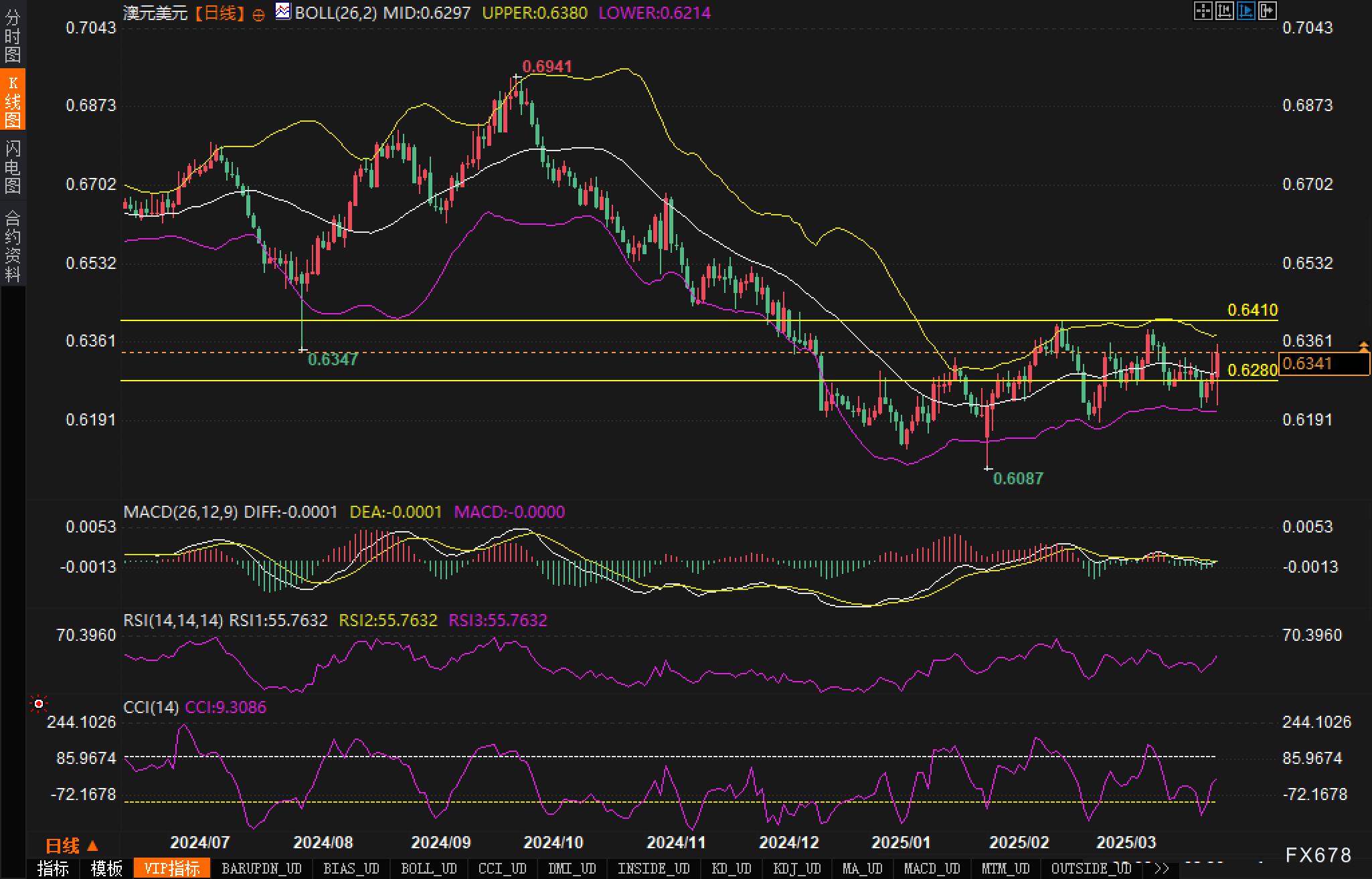 空头展望:鉴于特朗普贸易政策引发的避险情绪及澳大利亚贸易数据不及预期,澳元/美元可能面临下行压力。若跌破0.6280支撑位,下一目标将指向布林下轨0.6214,甚至测试0.6200的关键支撑。MACD指标虽略显疲软,但未出现明显死叉信号,表明短期内急剧下跌的可能性有限。