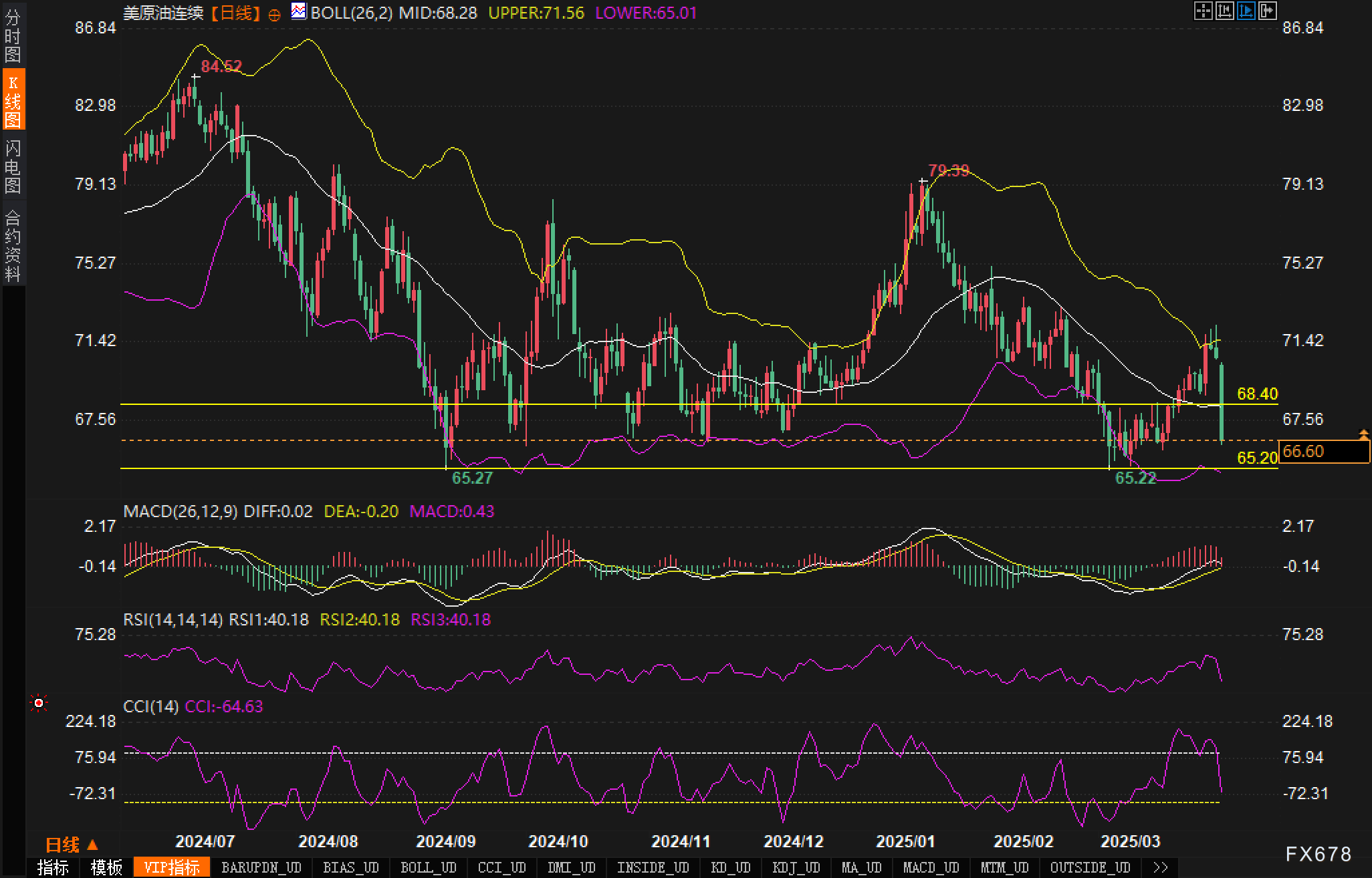 关键价位:上方阻力71.54(布林上轨),下方支撑65.07(布林下轨),中期多空分水岭关注70美元心理关口。