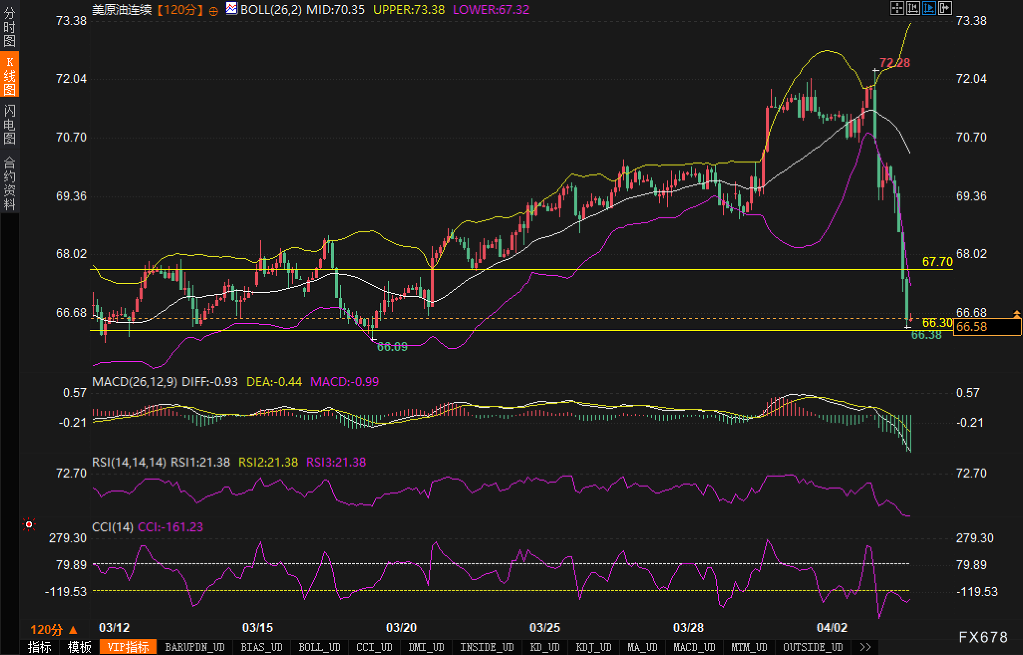 布林带下轨告破!原油技术面现死亡交叉,多空后市争夺67关口