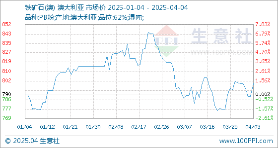 4月4日生意社铁矿石(澳)基准价为800.22元/吨