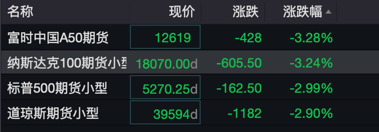 中国宣布对所有美国进口商品加征34%关税后,美股三大期指进一步下挫。截至发稿,纳斯达克100期货跌超3%,道琼斯期货跌超1100点、跌幅3%,标普500期货跌近2%。
