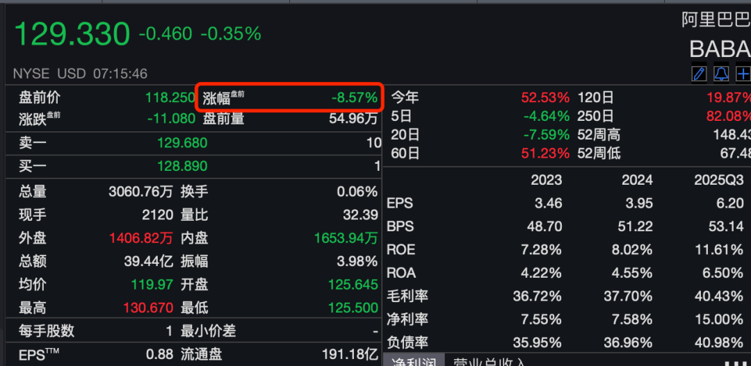 富时中国A50期货也大跌超3%。热门中概股美股盘前全线下挫,阿里巴巴跌超8%。