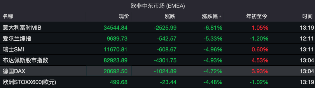 还处于交易过程中的欧洲股市持续下跌。截至发稿,意大利富时MIB指数大跌近7%,瑞士SMI跌近5%,德国DAX指数、法国CAC40指数等跌超4%,英国富时100指数跌近4%。