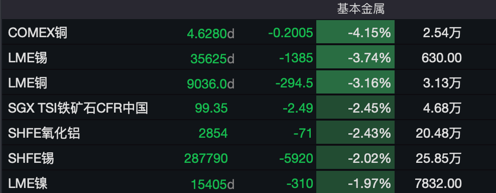 此外,铜等金属期货价格也出现大跌,COMEX铜跌超4%,LME锡跌近4%。