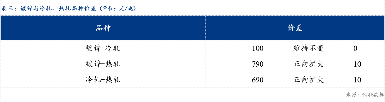 今日冷轧板卷乐从与天津价差较上一交易日扩大20元/吨,乐从与上海价差较上一交易日扩大10元/吨;镀锌板卷乐从与天津价差较上一交易日持平,与上海价差较上一交易日持平。品种价差方面,镀冷价差较上一交易持平,镀热价差较上一交易日扩大10元/吨,冷热价差较上一交易日扩大10元/吨。