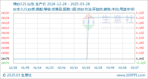 3月28日,生意社棉纱32S基准价为24125.00元/吨,与本月初持平。