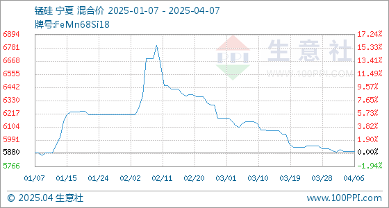 4月7日,生意社锰硅基准价为5892.00元/吨,与本月初(5900.00元/吨)相比,下降了-0.14%。