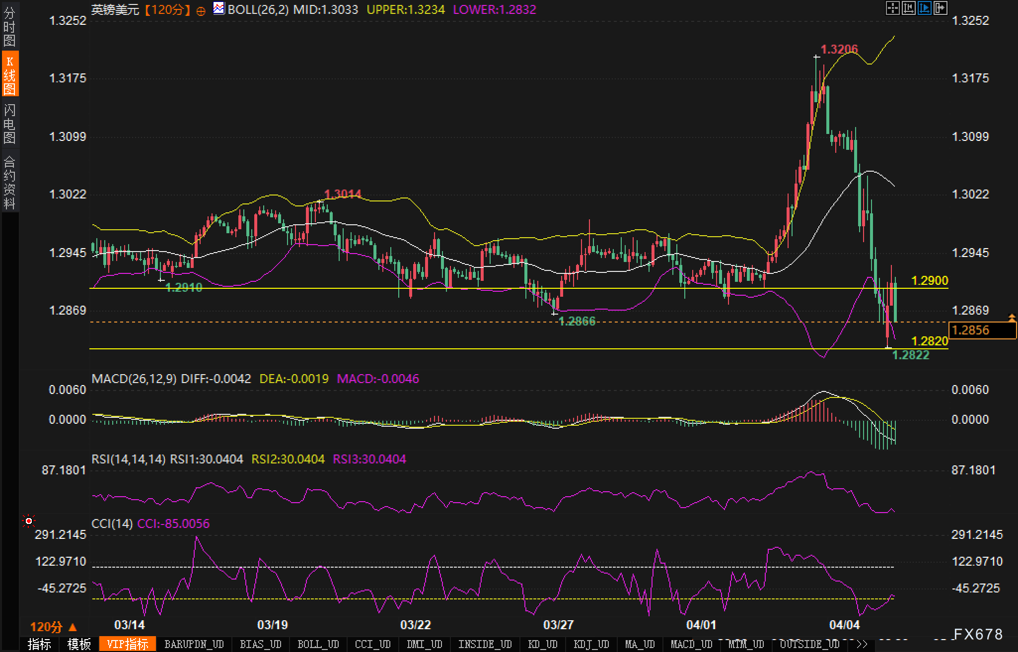 布林带指标显示价格正处于下轨附近,显示出超卖状态,这通常是价格可能反弹的信号。1.2900作为心理整数关口正在提供初步阻力,而1.2850水平则成为更为关键的支撑区域。同时,RSI指标读数为30.04,处于超卖区域边缘,暗示短期内可能出现技术性反弹。