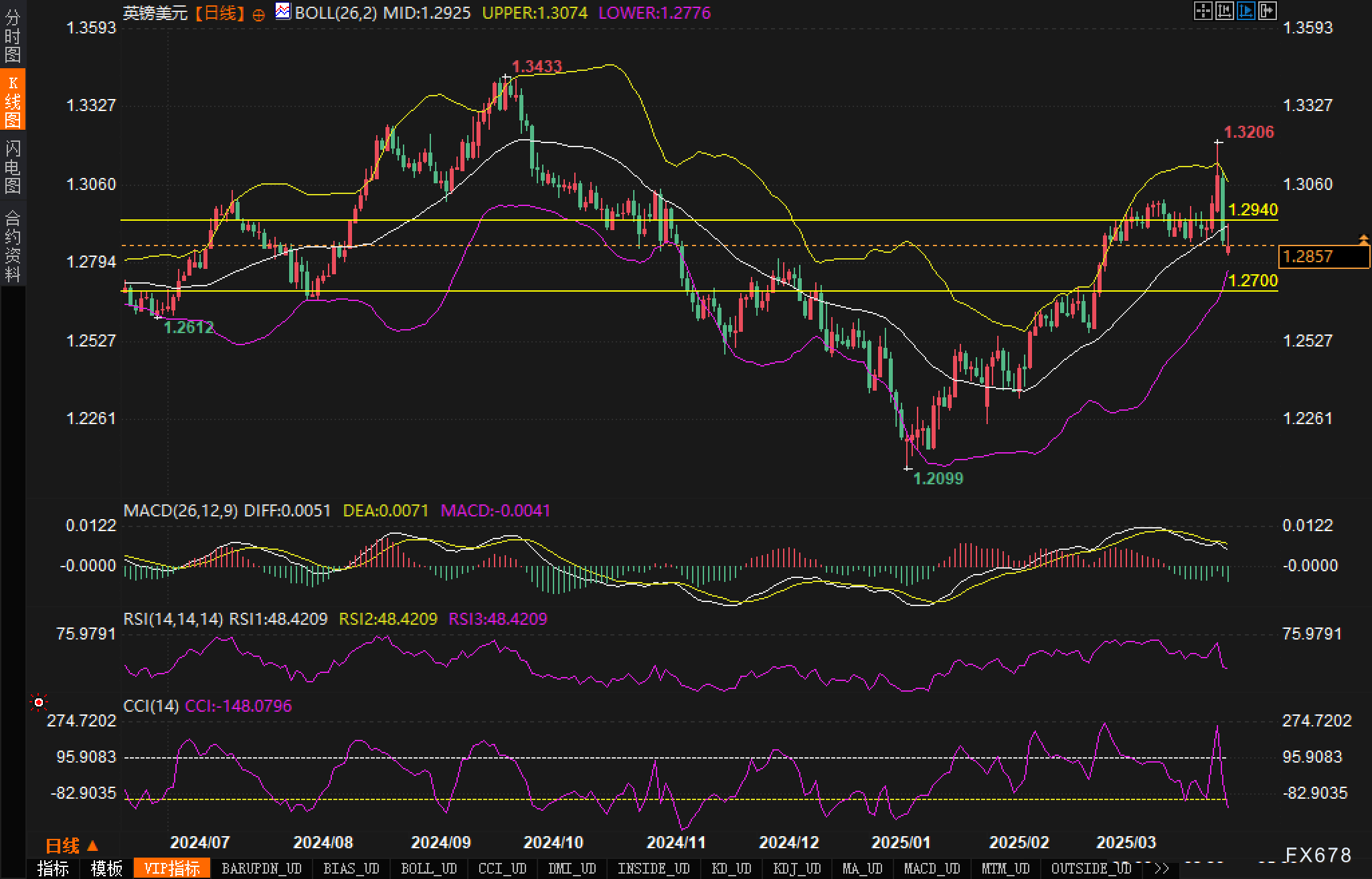 日线图技术形态更引人关注。汇价在近几个月形成了一个完整V型反转形态,1月低点为1.2099,信号线位于1.2700附近。此形态已成功突破并得到确认,目标指向1.3300区域。布林带上轨1.3074提供了关键阻力区,而中轨1.2925则为短期的重要参考点。