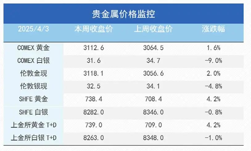 上周金价冲高回落,银价大幅下跌,COMEX金银于3032-3202美元/盎司、29.1-35.2美元/盎司区间内运行。上周特朗普宣布对等关税,因其猛烈程度超出市场预期,此后多国均准备出台应对政策用以反击,市场快速转向对美国乃至全球衰退预期定价,而联储的表态加深了市场的恐慌,开启大量抛售资产,白银跌幅领先,黄金相对抗跌但也难以幸免。