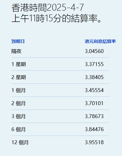 4月7日,贸易战激化触发全球股市大跌,港元汇率今早最低见7.7680兑1美元,为3月11日以来最低,港元拆息普遍上升,其中隔夜息升至3.0456%,一周拆息升28基点至3.37155%,而与楼按相关的一个月拆息结束六连跌,微升至3.45554%。