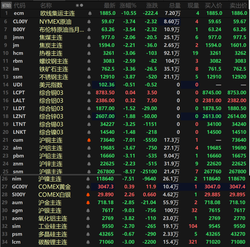此外,碳酸锂主连跌3%,工业硅主连跌2.7%,多晶硅主连跌0.67%。欧线集运主连大跌10.55%。
