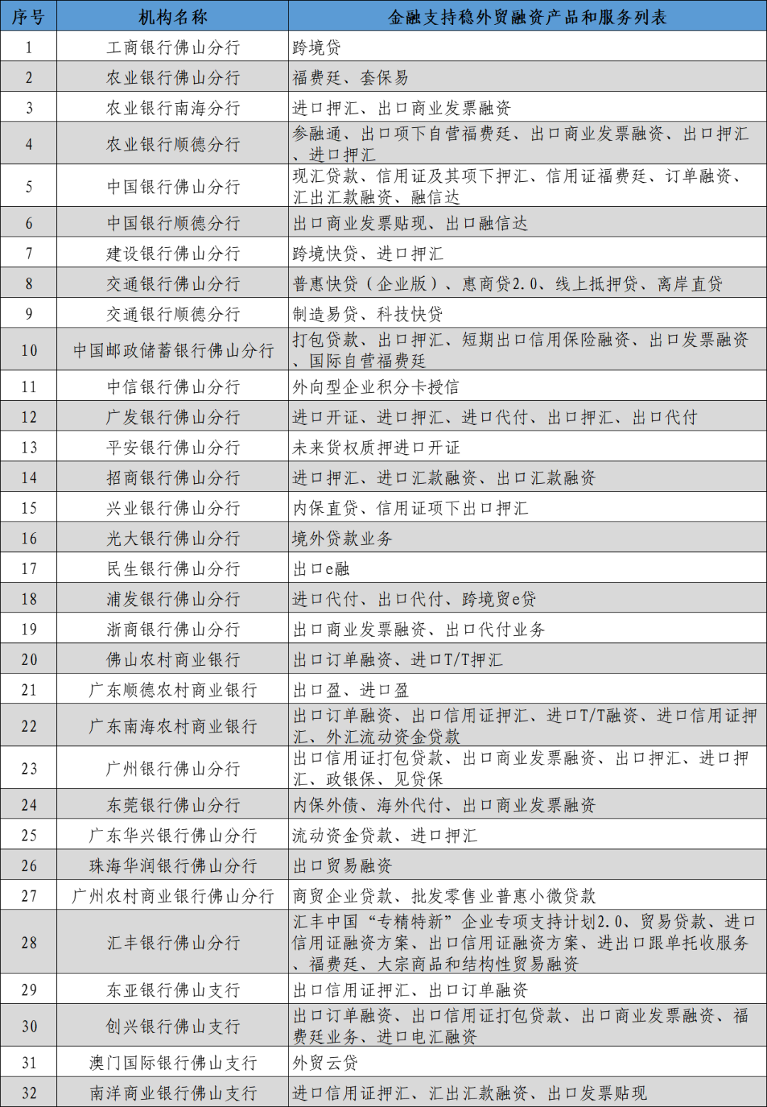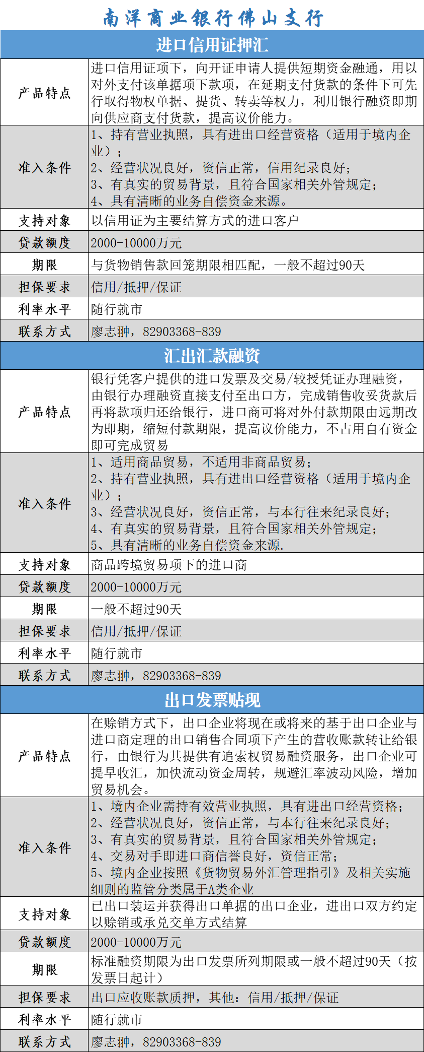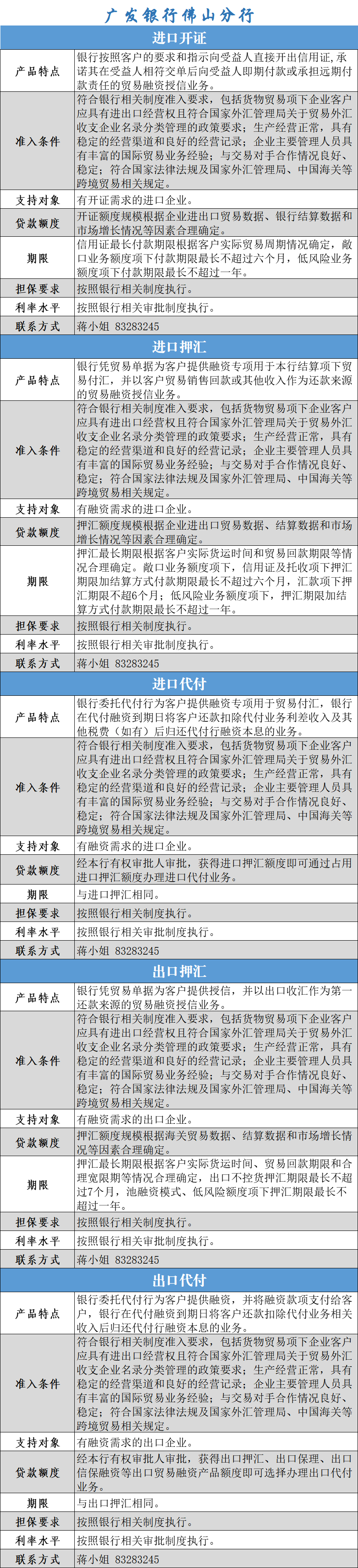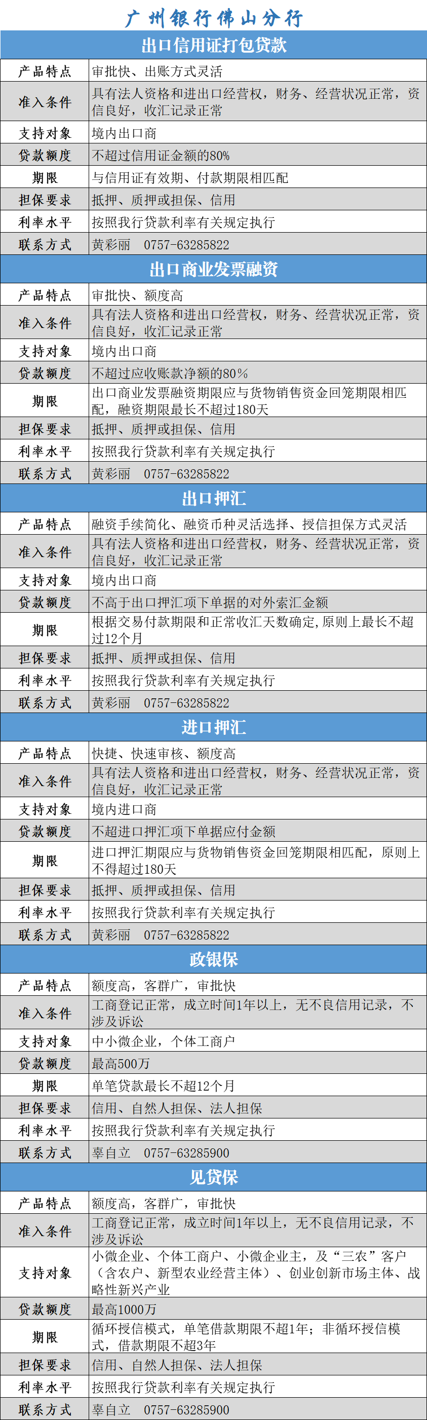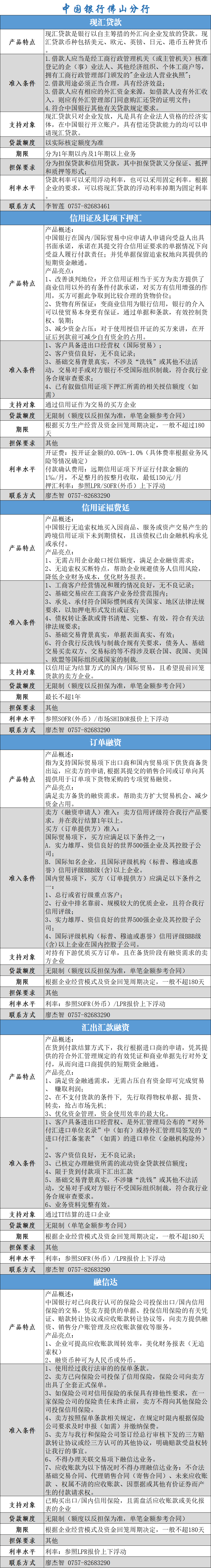 为贯彻落实党中央、国务院稳外贸工作决策部署,进一步加大对各类外贸主体的金融支持,优化融资、结算、外汇等金融服务,中国人民银行佛山市分行、国家外汇管理局佛山市分局积极引导辖内银行业金融机构创新服务产品,整理形成融资、结算、外汇等系列金融支持稳外贸产品和服务汇编,现予发布第一期——外贸专属融资服务产品,有融资需求的市场主体可向相关金融机构咨询办理。