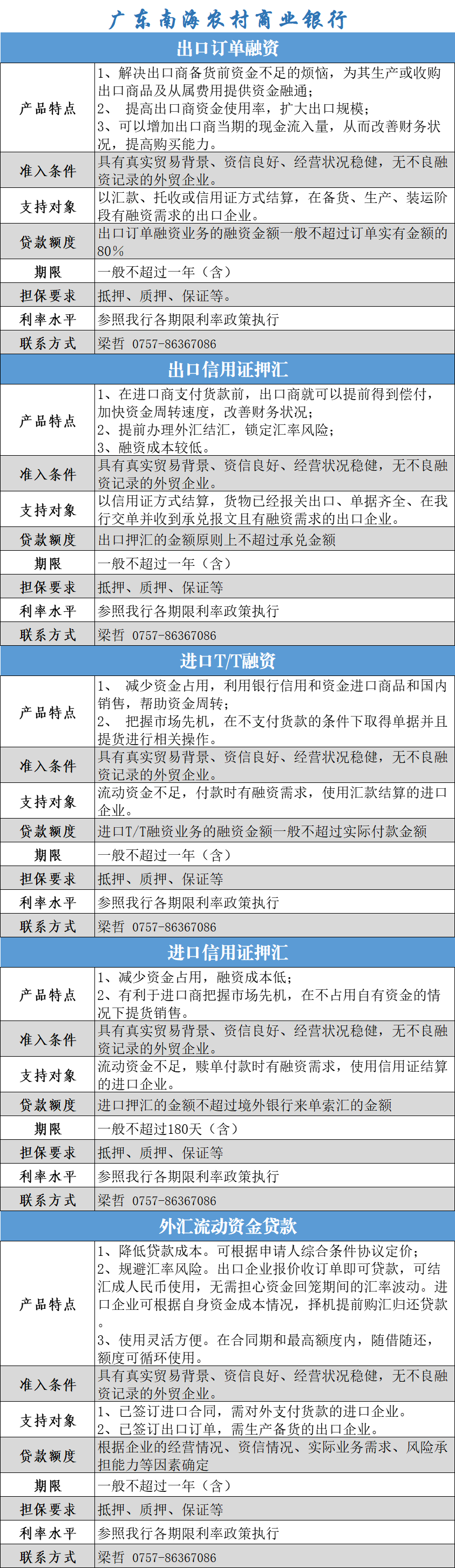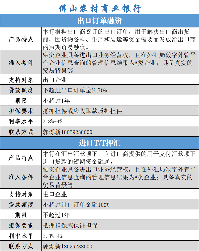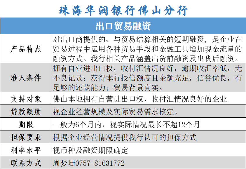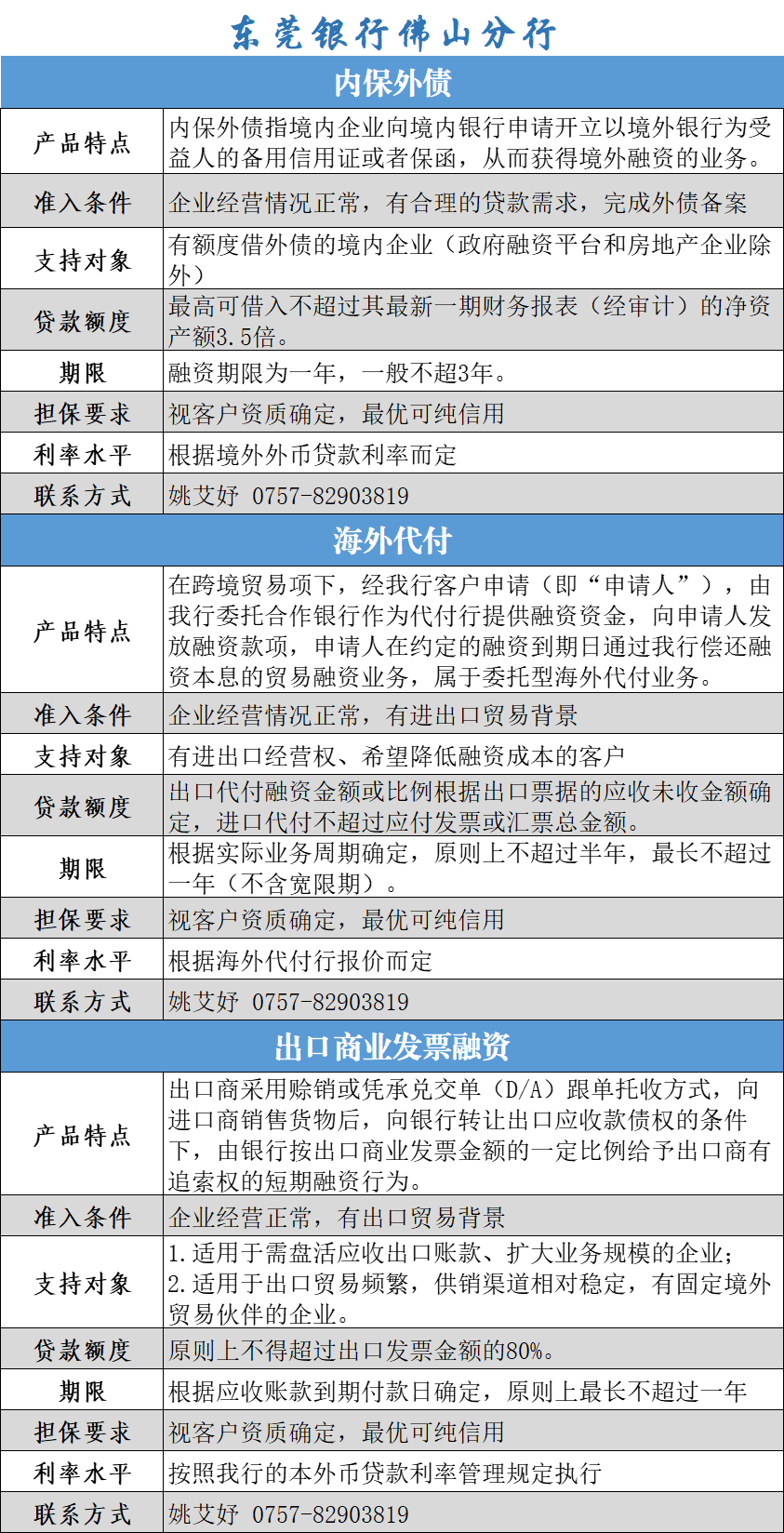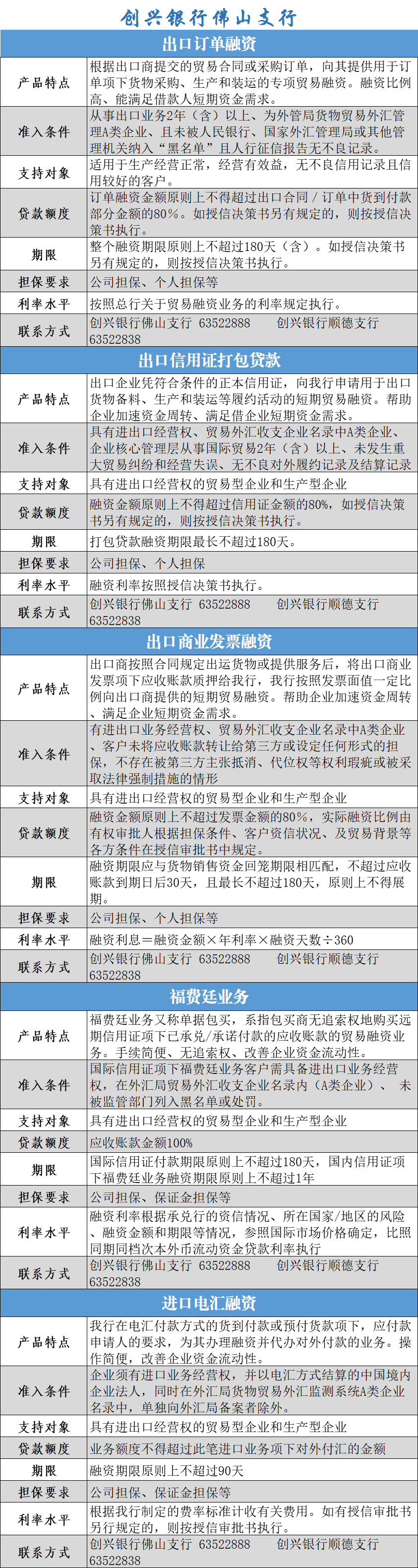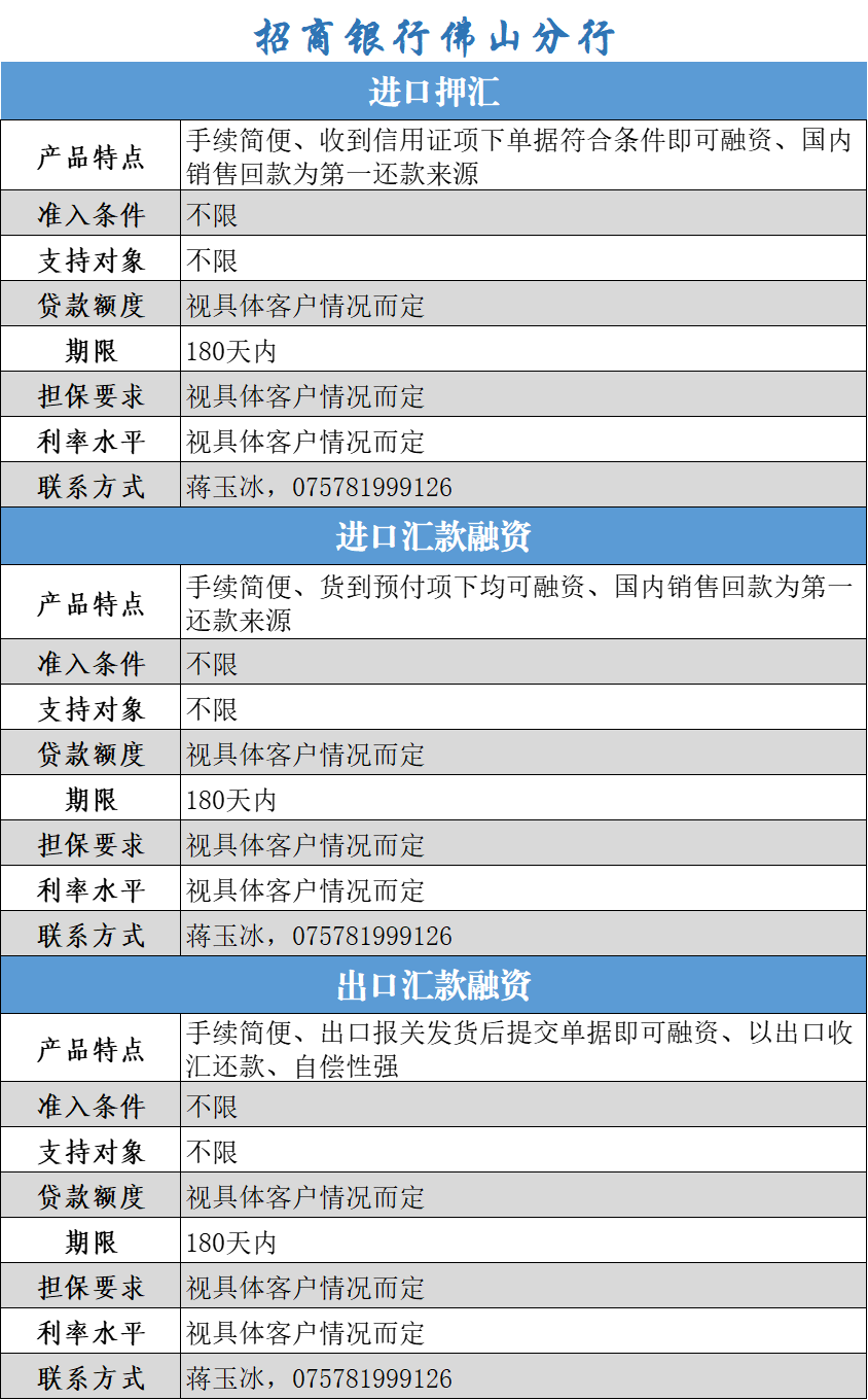 为贯彻落实党中央、国务院稳外贸工作决策部署,进一步加大对各类外贸主体的金融支持,优化融资、结算、外汇等金融服务,中国人民银行佛山市分行、国家外汇管理局佛山市分局积极引导辖内银行业金融机构创新服务产品,整理形成融资、结算、外汇等系列金融支持稳外贸产品和服务汇编,现予发布第一期——外贸专属融资服务产品,有融资需求的市场主体可向相关金融机构咨询办理。