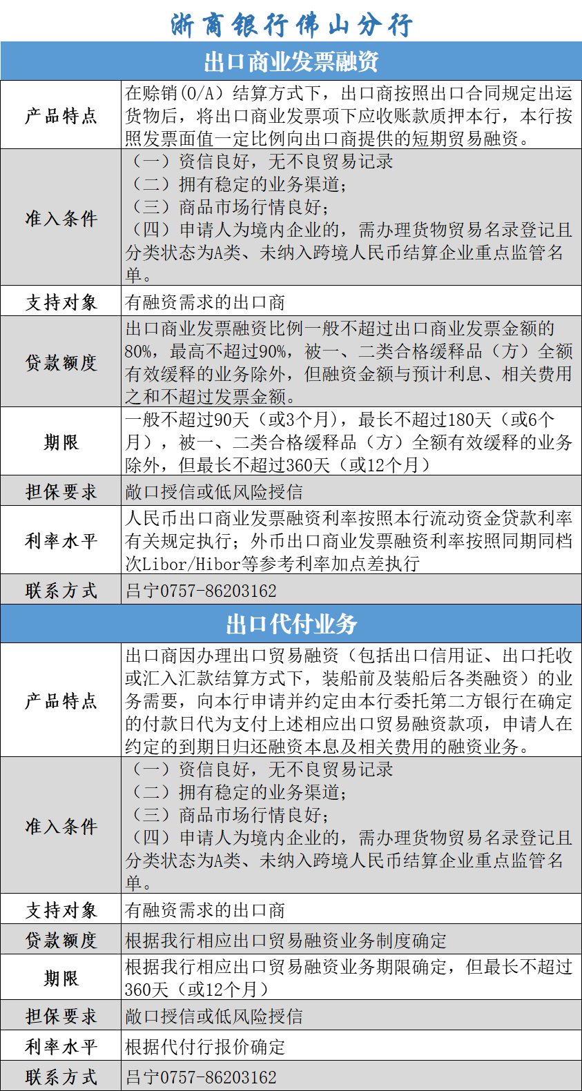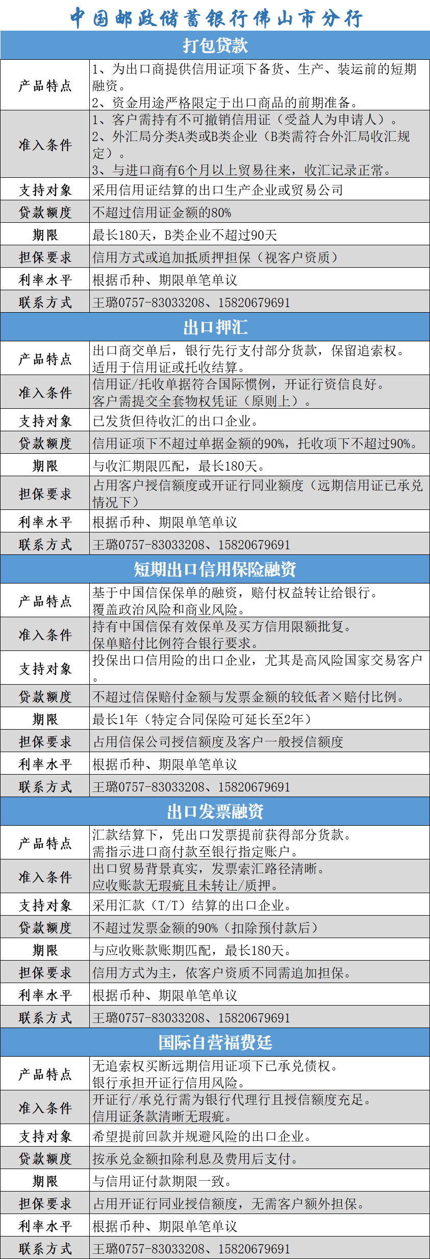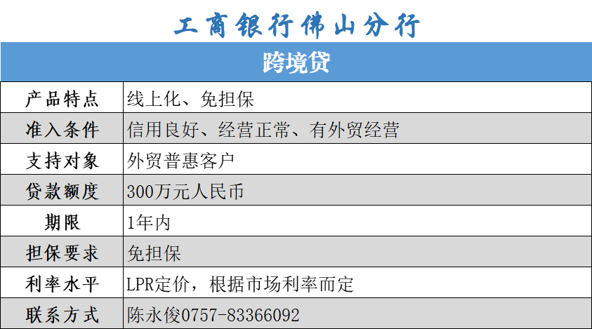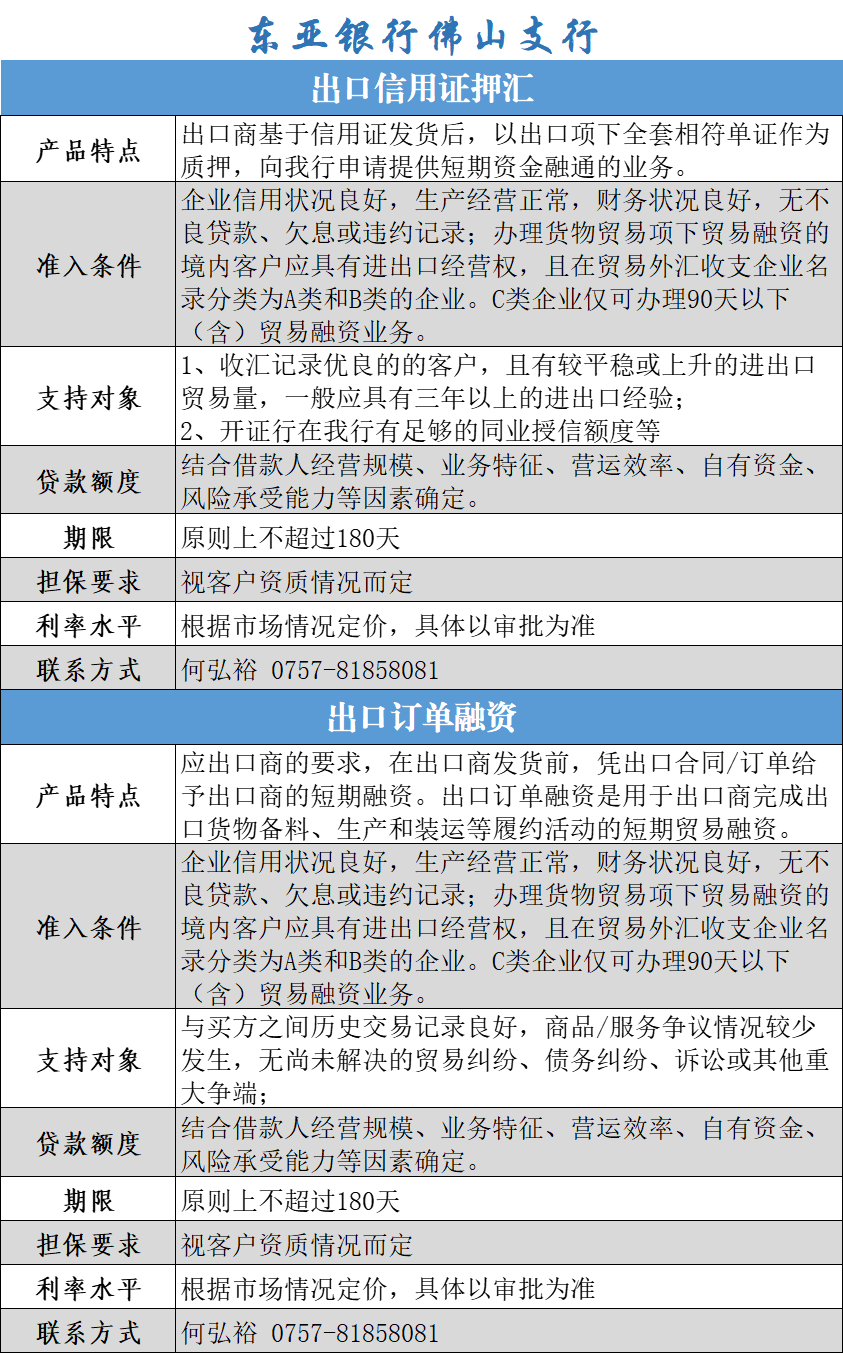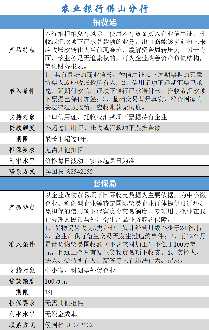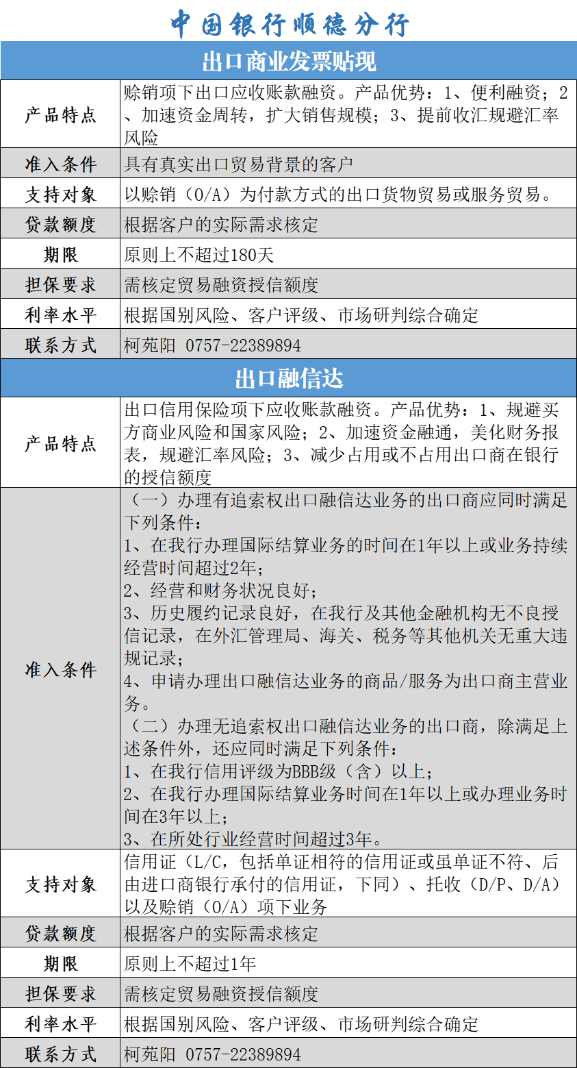为贯彻落实党中央、国务院稳外贸工作决策部署,进一步加大对各类外贸主体的金融支持,优化融资、结算、外汇等金融服务,中国人民银行佛山市分行、国家外汇管理局佛山市分局积极引导辖内银行业金融机构创新服务产品,整理形成融资、结算、外汇等系列金融支持稳外贸产品和服务汇编,现予发布第一期——外贸专属融资服务产品,有融资需求的市场主体可向相关金融机构咨询办理。