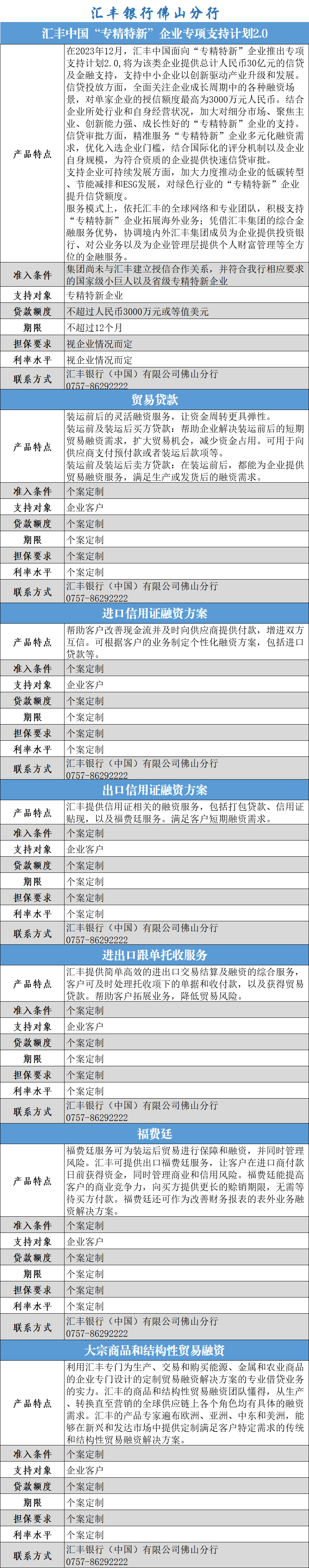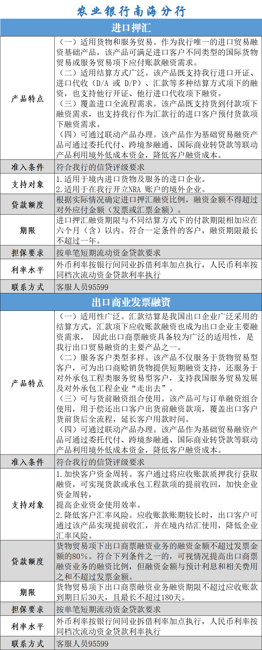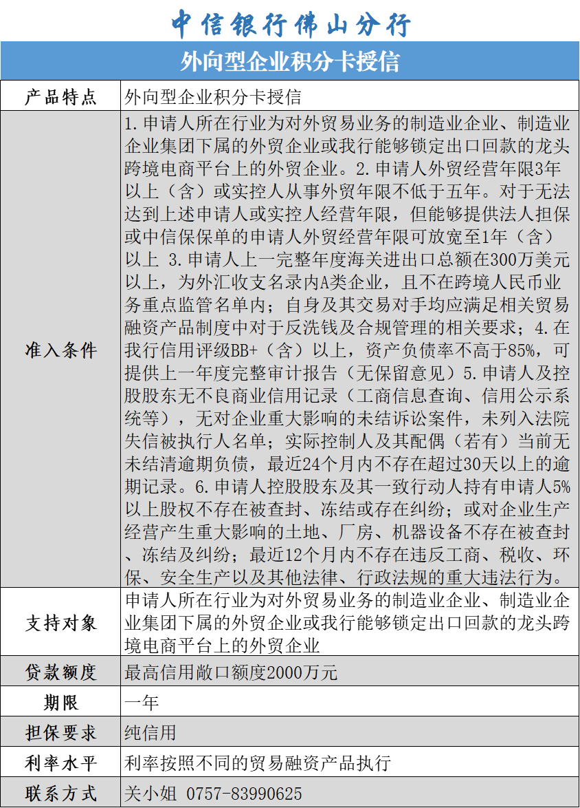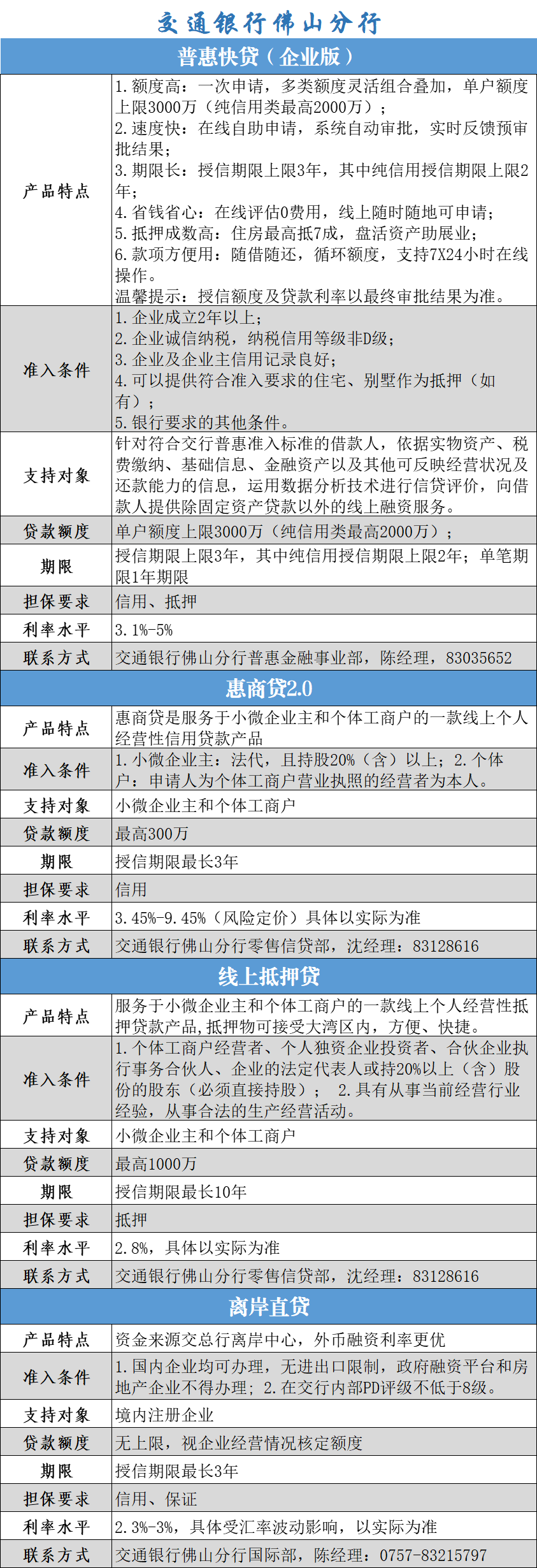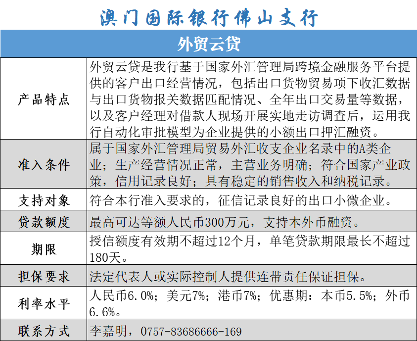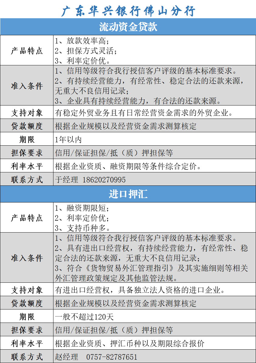 为贯彻落实党中央、国务院稳外贸工作决策部署,进一步加大对各类外贸主体的金融支持,优化融资、结算、外汇等金融服务,中国人民银行佛山市分行、国家外汇管理局佛山市分局积极引导辖内银行业金融机构创新服务产品,整理形成融资、结算、外汇等系列金融支持稳外贸产品和服务汇编,现予发布第一期——外贸专属融资服务产品,有融资需求的市场主体可向相关金融机构咨询办理。