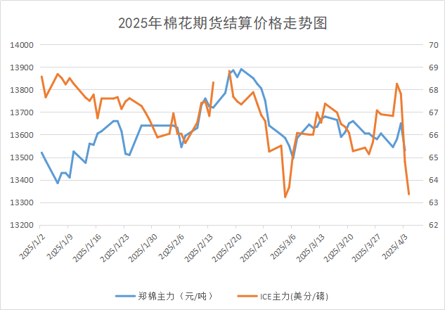 国际方面:USDA发布最新一期美棉意向种植面积报告,美棉意向面积调降至5989.6万亩,同比减幅11.8%,面积调减的影响下上周三ICE期棉主力最高上涨至68.58美分/磅。随后美国实施对等关税影响下,加剧市场避险情绪,ICE期棉大幅下挫,截至4月4日,ICE期棉结算价63.36美分,周跌幅为5.19%。