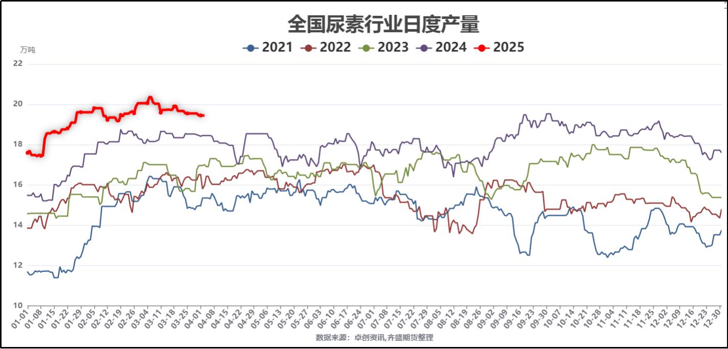 供应持续保持高位运行,目前日产仍在19.5万吨左右,同比高出1万吨。从2025年一季度来看,总产量已经高出同期近150万吨,且4月份江苏恒盛、新疆奥福化工、新疆新冀化工或面临投产,将再次增加尿素供应,尿素行业高供应成为常态,加之暂时没有出口,成为长期压制行情的重要因素。