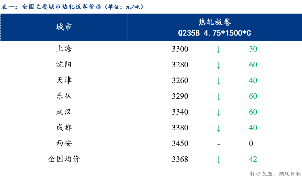 今日热轧板卷全国主要城市价格宽幅下跌,截止发稿时3.0mm热轧板卷全国均价3424元/吨,较上个交易日下跌41元/吨。4.75mm热轧板卷全国均价3369元/吨,较上个交易日下跌41元/吨。今日黑色商品期货宽幅下行,热卷10合约收跌3.06%,现货价格下跌20-70元/吨,整体成交偏弱。