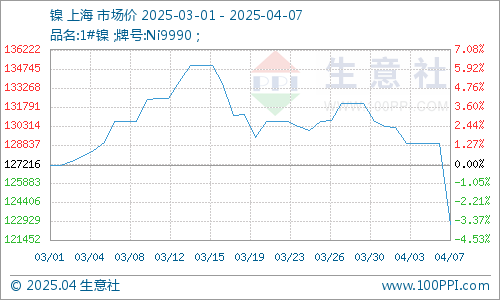 据生意社商品行情分析系统监测,截止4月7日,现货电解镍报122683元/吨,周跌幅5.83%。