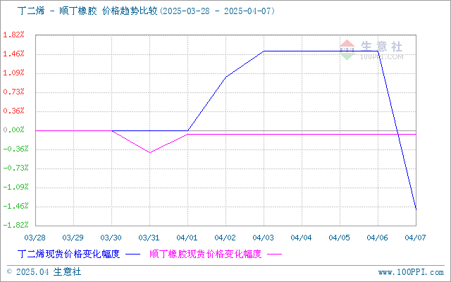 据生意社商品行情分析系统,3月31日至4月7日,国内丁二烯市场价格由11000元/吨下调至10833.33元/吨,周期内价格下调1.52%。本周期,国内丁二烯市场周内走势先涨后跌,整体下行。假期临近影响部分下游跌后补仓,周初市场成交较为集中,随着部分竞拍货源溢价成交,市场行情重心显著上行。虽供应端价格坚挺,但周后期高位报盘成交略显僵持,同时美国加征关税消息影响期货下跌,消息面影响下游买盘谨慎,市场经过短期震荡后,周四午后价格显著下行。截至4月7日,山东地区送到价格在10900元/吨。