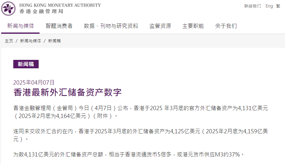 4月7日,香港金融管理局公布,香港于2025年3月底的官方外汇储备资产为4131亿美元(2025年2月底为4164亿美元)。连同未交收外汇合约在内,香港于2025年3月底的外汇储备资产为4125亿美元(2025年2月底为4159亿美元)。为数4131亿美元的外汇储备资产总额,相当于香港流通货币5倍多,或港元货币供应M3约37%。