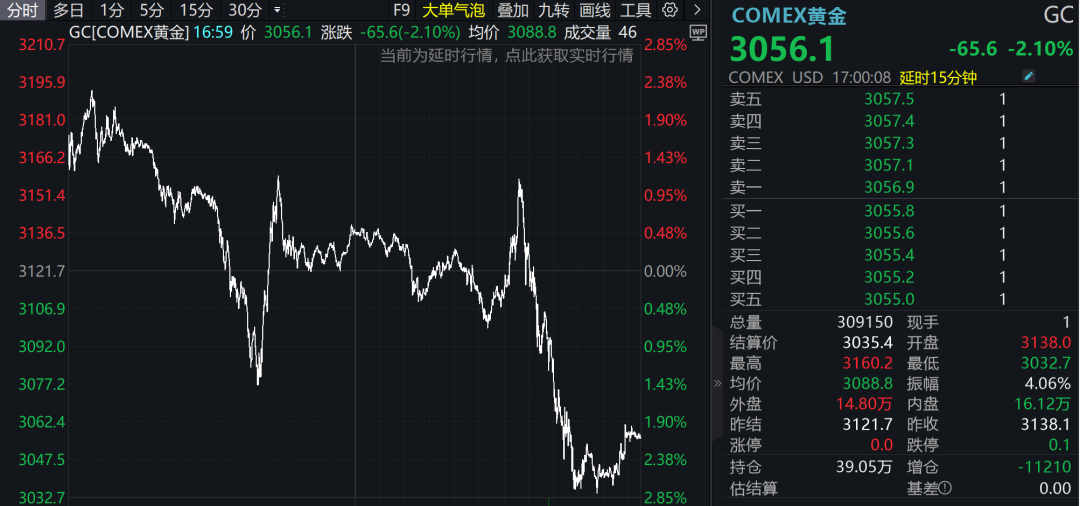 国际黄金价格连续两天高位跳水。现货黄金目前跌幅为2.84%,报3025.705美元/盎司。纽约期金也跌超2%,最新报3056.1美元/盎司,两天内自高点跳水近150美元/盎司。