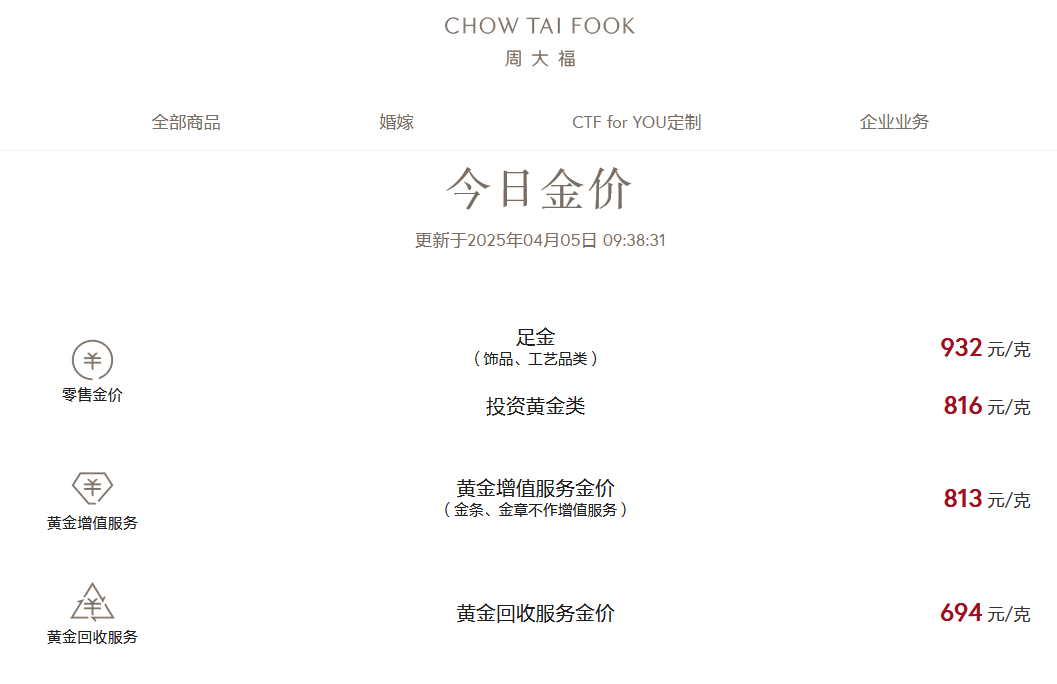 随着国际金价的高位调整,知名黄金品牌金价也出现了下调。4月5日,周生生的足金饰品零售价格为926元/克,周大福则为932元/克。