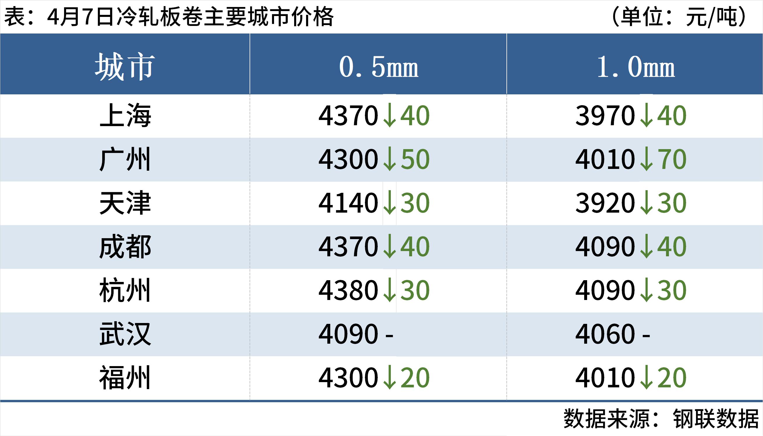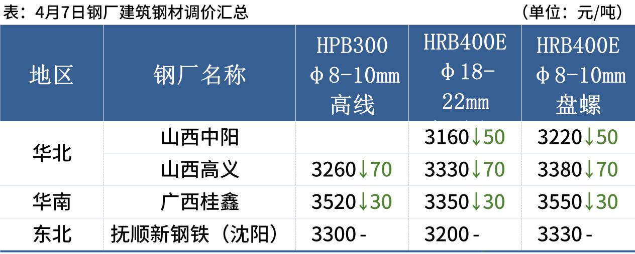 4月7日,国内3家钢厂下调建筑钢材出厂价30-70元/吨。