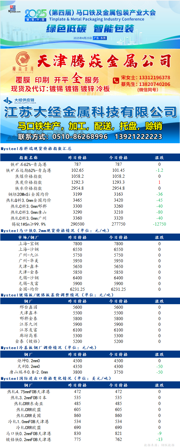 Mysteel日报:镀锡板原料端价格窄幅波动