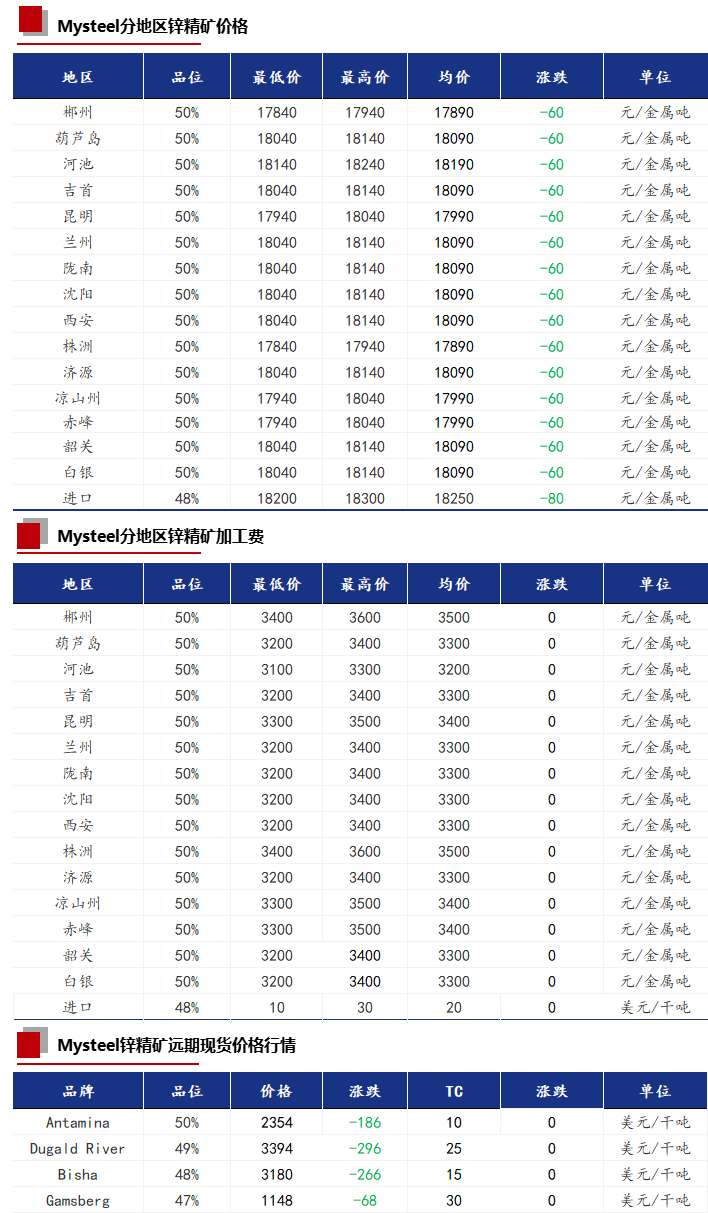 今日受锌价的影响,锌精矿价格下降60元/金属吨。国内锌精矿加工费各地区均未调整,和上一交易日持平。进口TC市场主流报价在10-30美元/干吨,暂无波动。