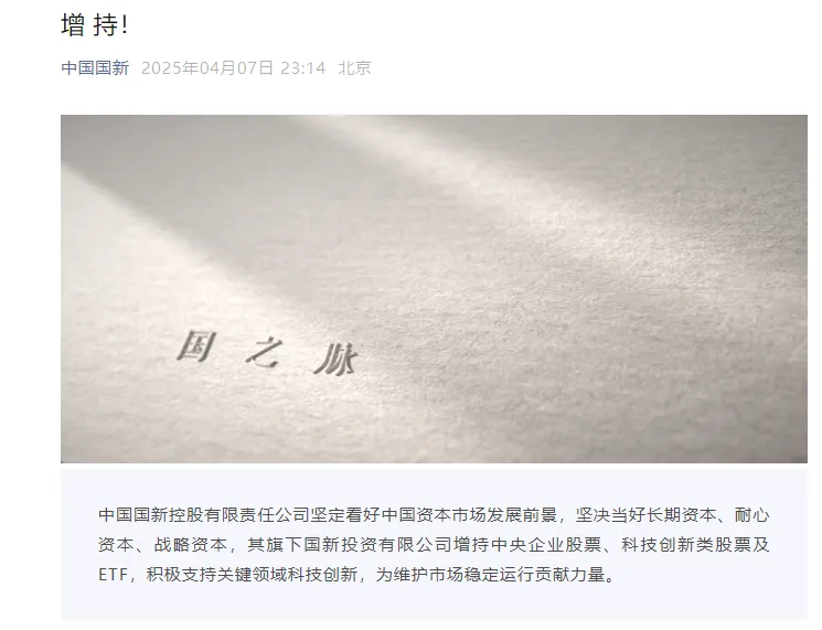 4月7日晚间,中国国新控股有限责任公司公告称,坚定看好中国资本市场发展前景,坚决当好长期资本、耐心资本、战略资本,其旗下国新投资有限公司增持中央企业股票、科技创新类股票及ETF,积极支持关键领域科技创新,为维护市场稳定运行贡献力量。